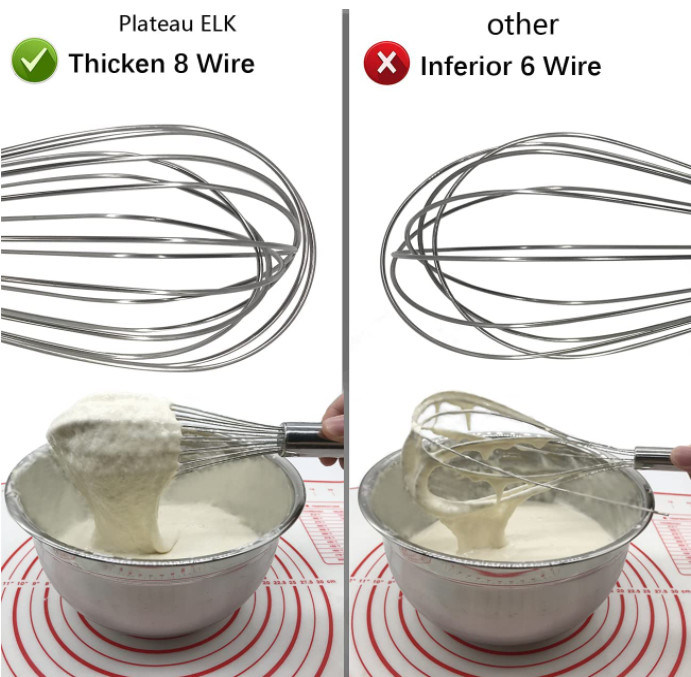 1)Batteur renforcé en métal : 12 pouces du batteur de catégorie alimentaire d'acier inoxydable ont adopté le fil 8 audacieux traitant, qui résout la douleur du recourbement ou la ligne rupture de quelques batteurs communs pour faire cuire sur le marché pendant le mélange et l'agitation lourds. Les fils n'obtiennent pas embrouillés dans l'un l'autre et l'espacement aide des liquides de batteur de fil mieux.